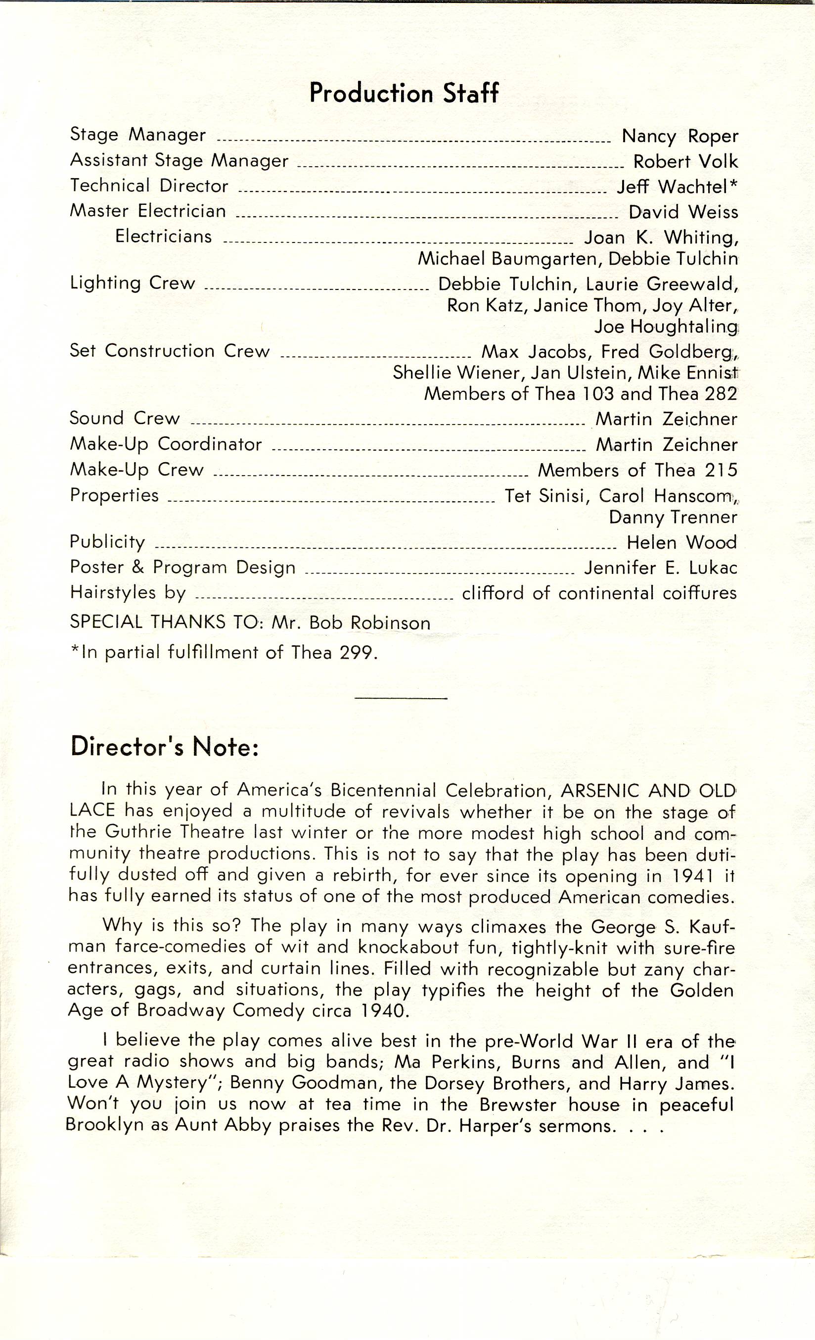 1976 Fall Arsenic and Old Lace directed by Richard Cuyler